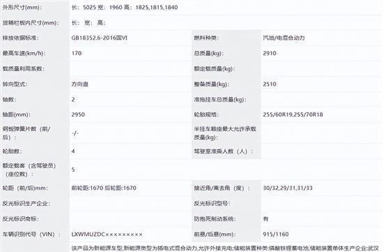 车身尺寸方面,增程版长宽高为5025/1960/1815-1840mm,轴距2950mm,整备质量2510kg。车身长度比现款燃油版烈马略长、宽度有所减小,轴距保持一致。接近角 / 离去角提供30°/32°、29°/31°、31°/33° 三组选择,轮胎规格提供255/60R19和255/70R1两种选择,延续硬派越野风格。